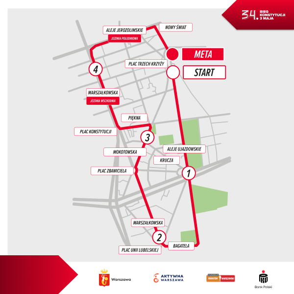 Dalej trasa skręca w ulicę Mokotowską, następnie w Kruczą i Piękną, by po chwili wyprowadzić na Plac Konstytucji – symboliczny punkt na mapie biegu 3 maja.