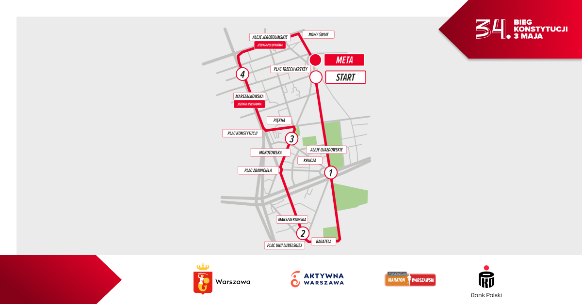Dalej trasa skręca w ulicę Mokotowską, następnie w Kruczą i Piękną, by po chwili wyprowadzić na Plac Konstytucji – symboliczny punkt na mapie biegu 3 maja.